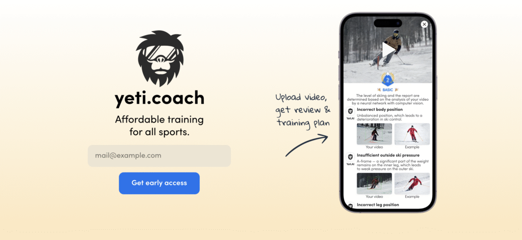 Yeti Coach in a nutshell is an AI-powered platform that democratizes ski training using computer vision. It’s simple – you upload your skiing video or get filmed on a dedicated smart slope, and the system will identify technical mistakes and provide tailored, affordable training plans.